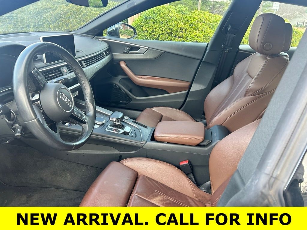 Black Metallic 2018 Audi A5 2.0T Premium Plus quattro 2.0L 4-Cylinder TFSI 19" S line Wheel Package (Wheels: 19" x 8.5" 5-Parallel-Spoke Design), Cold Weather Package (Heated 3-Spoke Steering Wheel w/Shift Paddles and Heated Rear Seats), Convenience Package (Alarm System w/Motion Sensors, Audi Advanced Key, Driver Seat Memory, Heated Auto-Dimming Power/Memory Exterior Mirrors, and SiriusXM All Access Service), Navigation Package (12.3" LCD Display Audi Virtual Cockpit and Audi MMI Navigation Plus w/MMI Touch), Premium Plus (Audi Side Assist, Full LED Headlights, Heated Auto-Dimming Power Ext Mirrors w/Memory, Heated Front Seats, Parking System Plus (Front/Rear Acoustic Sensors), and Rear Audi Pre Sense), S line Sport Package (Front Sport Seats, S Line Bumpers, S Line Fender Badges, S line Side Sill Blades, Sport Suspension, and Wheels: 18" x 8.5" 5-Arm-Star Design), 10 Speakers, 4-Wheel Disc Brakes, ABS brakes, Air Conditioning, Alloy wheels, AM/FM radio, Anti-whiplash front head restraints, Audi smartphone interface (Apple CarPlay/Android Auto), Auto-dimming Rear-View mirror, Automatic temperature control, Bang & Olufsen Sound System w/3D Sound, Brake assist, Bumpers: body-color, Compass, Delay-off headlights, Delete Front License Plate Holder, Driver door bin, Driver vanity mirror, Dual front impact airbags, Dual front side impact airbags, Electronic Stability Control, Exterior Parking Camera Rear, Four wheel independent suspension, Front anti-roll bar, Front Bucket Seats, Front Center Armrest, Front dual zone A/C, Front fog lights, Front reading lights, Garage door transmitter: HomeLink, Gray Oak Wood Natural Inlays, Heated door mirrors, High intensity discharge headlights: Bi-xenon, Illuminated entry, Knee airbag, Leather Seating Surfaces, Leather Shift Knob, Leather steering wheel, Occupant sensing airbag, Outside temperature display, Overhead airbag, Overhead console, Panic alarm, Passenger door bin, Passenger vanity mirror, Power adjustable front head restraints, Power door mirrors, Power driver seat, Power Liftgate, Power moonroof, Power passenger seat, Power steering, Power windows, Radio data system, Radio: Audi Sound System, Rain sensing wipers, Rear air conditioning, Rear anti-roll bar, Rear reading lights, Rear seat center armrest, Rear window defroster, Remote keyless entry, Rings Audi Beam, Speed control, Speed-sensing steering, Speed-Sensitive Wipers, Split folding rear seat, Steering wheel mounted audio controls, Tachometer, Telescoping steering wheel, Tilt steering wheel, Traction control, Trip computer, Turn signal indicator mirrors, USB Cables (DISC), Variably intermittent wipers, and Wheels: 18" x 8.5" 10-Spoke-Dynamic-Design.
