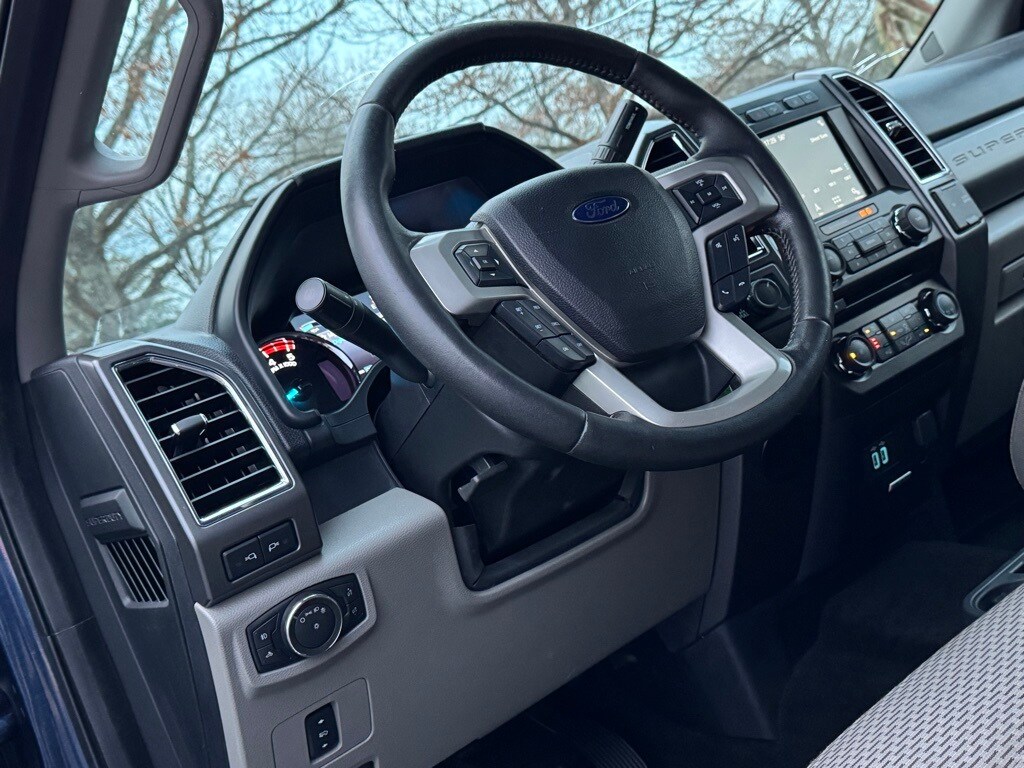 Blue 2017 Ford F-250SD XLT 4WD Power Stroke 6.7L V8 DI 32V OHV Turbodiesel FX4 Off-Road Package (Colored Front & Rear Rancho Branded Shocks, Hill Descent Control, and Unique FX4 Off-Road Box Decal), GVWR: 10,000 lb Payload Package, High Capacity Trailer Tow Package, Order Code 603A, XLT Driver Assistance Package (DISC) (8" Productivity Screen, Adaptive Steering (DISC), Automatic High Beam, Lane-Keeping Alert, and Leather-Wrapped Steering Wheel), XLT Premium Package (4.2" Center-Stack Screen, 6" Angular Chrome Step Bars, 8-Way Power Driver's Seat, Autolock/Auto Unlock, Body-Color Door Handles w/Chrome Insert, Chrome Exhaust Tip, Fog Lamps, Heated Driver & Passenger Seats, Power-Adjustable Pedals, Reverse Sensing System, SecuriCode Driver's Side Keyless Entry Keypad, and Unique Chrome Mirror Caps), 4-Wheel Disc Brakes, 7 Speakers, ABS brakes, Air Conditioning, Alloy wheels, AM/FM radio: SiriusXM, BLIS Blind Spot Information System, Brake assist, Bumpers: chrome, CD player, Cloth 40/20/40 Split Bench Seat, Compass, Delay-off headlights, Driver door bin, Driver vanity mirror, Dual front impact airbags, Dual front side impact airbags, Electronic Stability Control, Emergency communication system: 911 Assist, Engine Block Heater, Exterior Backup Alarm (Pre-Installed), Exterior Parking Camera Rear, Fixed Rear-Window w/Defrost, Front anti-roll bar, Front Center Armrest w/Storage, Front reading lights, Fully automatic headlights, Heated door mirrors, Illuminated entry, LED Roof Clearance Lights, Low tire pressure warning, Outside temperature display, Overhead airbag, Overhead console, Panic alarm, Passenger cancellable airbag, Passenger door bin, Passenger vanity mirror, Power door mirrors, Power steering, Power windows, PowerScope Trailer Tow Mirrors w/Heat, Privacy Glass, Radio data system, Radio: AM/FM Stereo/Single-CD/MP3 Player, Rear CHMSL Camera, Rear step bumper, Remote keyless entry, Security system, SiriusXM Radio, Speed control, Split folding rear seat, Steering wheel mounted audio controls, SYNC Communications & Entertainment System, Tachometer, Telescoping steering wheel, Tilt steering wheel, Tough Bed Spray-In Bedliner, Traction control, Trip computer, Turn signal indicator mirrors, Variably intermittent wipers, and Wheels: 18" Sparkle Silver Painted Cast Aluminum.