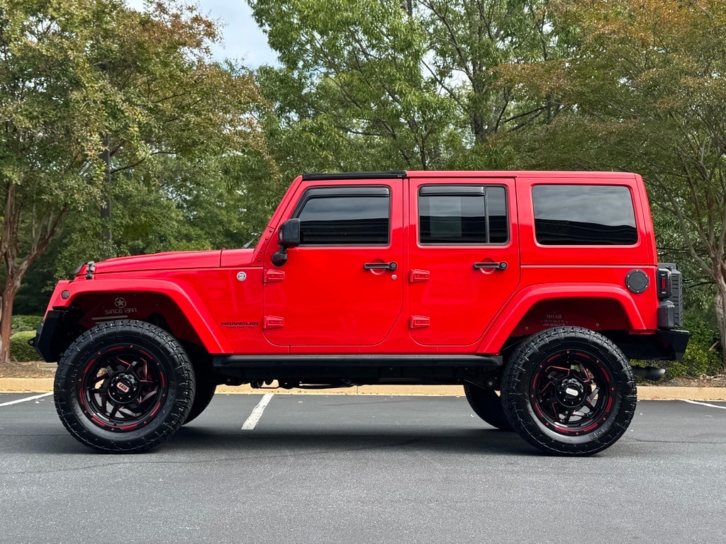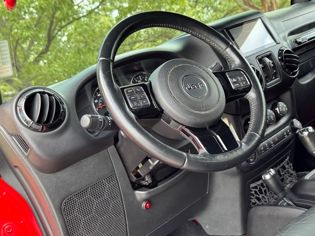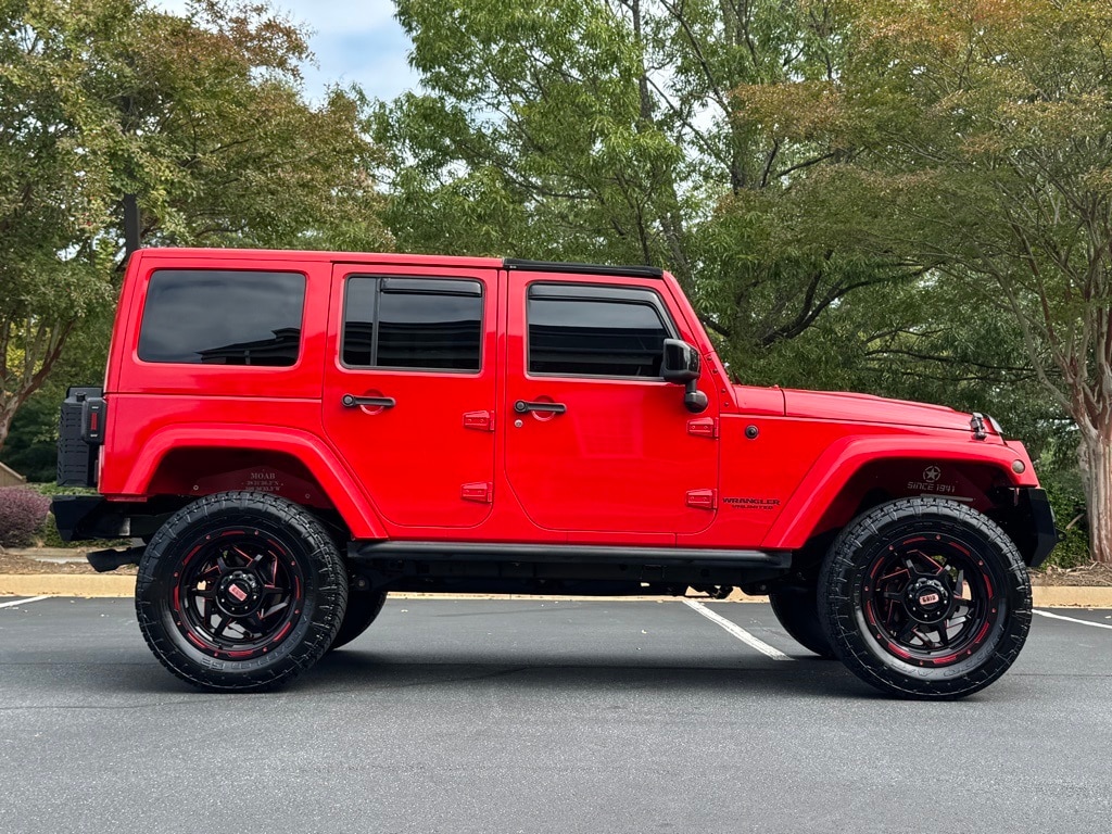 Firecracker Red Clear Coat 2015 Jeep Wrangler Unlimited Sahara Altitude 4WD 3.6L V6 24V VVT Connectivity Group (Tire Pressure Monitoring Display and Vehicle Information Center), Max Tow Package, Quick Order Package 24L Altitude (Altitude Grille, Black Accent Stitching, Black Front Bumper, Black High Gloss Exterior Mirror Cap, Black Jeep Grille Badge, Black Leather Seats w/Accent Stitch, Black Rear Bumper, Black/Chrome Screws Fuel Filler Door, Chrome/Leather Wrapped Shift Knob, Gloss Black Fascia Applique, Heated Front Seats, High Gloss Black Center Wheel Caps, Jeep Wrangler Altitude Edition, Low Gloss Black Wrangler Decal, MOPAR Black Tail Lamp Guards, Piano Black Interior Accents, Power Bulge Hood, and Wheels: 18" x 7.5" 5-Spoke Gloss Black Aluminum), Trailer Tow Group (Class II Receiver Hitch and Trailer Tow w/4-Pin Connector Wiring), 18" x 7.5" Polished Satin Carbon Wheels, 4-Wheel Disc Brakes, 40GB Hard Drive w/28GB Available, 5-Year SIRIUSXM Travel Link Service, 6.5" Touch Screen Display, 8 Speakers, ABS brakes, Air Conditioning, Air Conditioning w/Auto Temperature Control, Air Filtering, Alloy wheels, Alpine 9-Speaker w/All Weather Subwoofer, AM/FM radio, Anti-Spin Differential Rear Axle, Audio Jack Input for Mobile Devices, Auto-dimming Rear-View mirror, Brake assist, CD player, Cloth Bucket Seats, Compass, Driver door bin, Driver vanity mirror, Dual front impact airbags, Electronic Stability Control, Front anti-roll bar, Front Bucket Seats, Front Center Armrest w/Storage, Front fog lights, Front reading lights, Fully automatic headlights, GPS Navigation, Heated door mirrors, Heavy Duty Suspension w/Gas Shocks, Humidity Sensor, Illuminated entry, Integrated roll-over protection, Leather steering wheel, Leather Wrapped Steering Wheel, Low tire pressure warning, Occupant sensing airbag, Outside temperature display, Panic alarm, Passenger door bin, Passenger vanity mirror, Power door mirrors, Power steering, Power windows, Radio data system, Radio: Uconnect 130 AM/FM/CD/MP3, Radio: Uconnect 430N CD/DVD/MP3/HDD/NAV, Rear anti-roll bar, Remote keyless entry, Remote Start System, Remote USB Port, Security system, SIRIUSXM Travel Link, Speed control, Split folding rear seat, Steering wheel mounted audio controls, Supplemental Front Seat Side Airbags, Tachometer, Tilt steering wheel, Traction control, Trip computer, and Variably intermittent wipers.
